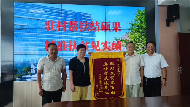 8月4日上午,陈仓区坪头镇大湾河村党支部书记焦新社、 监委会主任洪四宝一行来学校,将一面“驻村扶贫惠百姓,真情帮扶暖民心”的锦旗赠予学校,对学校长期以来对大湾河村的脱贫攻坚及驻村帮扶工作表示感谢。