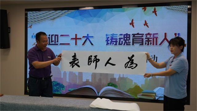 老师们走上演讲台,用丰富多彩的节目热情分享他们的教育故事和家国情怀:《醉美九月》《写给未来的你》《不忘初心筑梦前行》《如愿》《用生命影响生命》《我爱你中国》……,特别是党委书记、校长王亚梅用双语朗诵的《用生命影响生命》把节目推向了高潮。一篇篇激情的朗读,一首首动人的歌声,一句句亲切的祝福,表达了老师们对教育事业和教师职业的崇敬和热爱,赢得阵阵掌声。