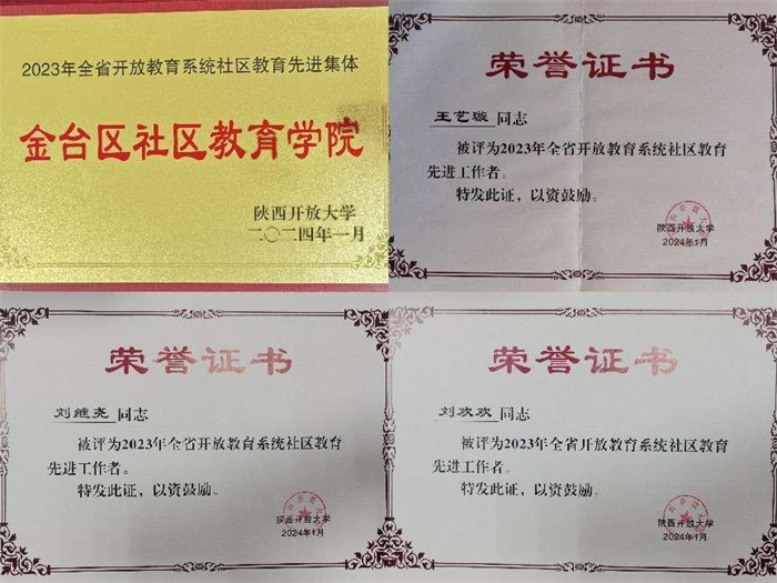 陈仓区学习中心、眉县学习中心被陕西开放大学评为2023年度教务工作先进单位,凤翔区学习中心被陕西开放大学评为招生工作先进单位,凤县学习中心被陕西开放大学评为优秀办学单位。金台区(学习中心)社区教育学院被陕西开放大学评为2023年全省开放教育系统社区教育先进集体。