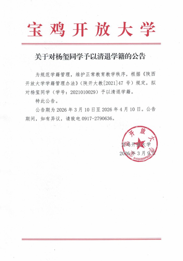 关于对杨玺同学予以清退学籍的公告